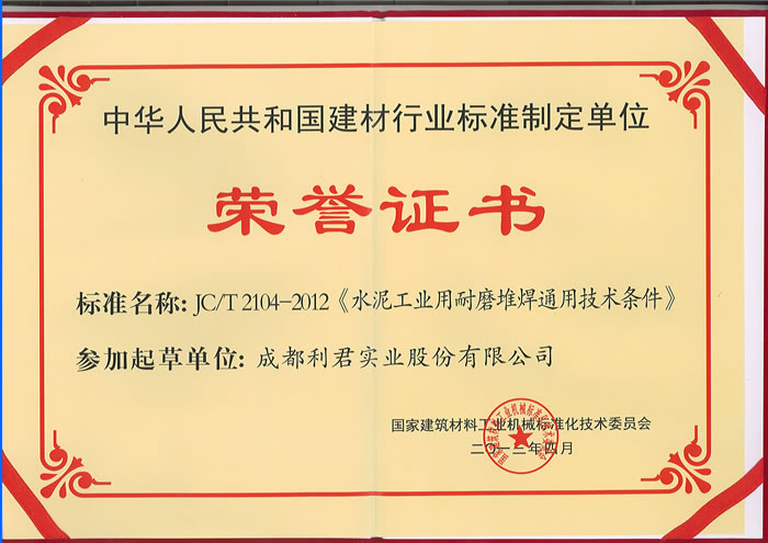 我公司榮獲“中華人民共和國建材行業(yè)標準制定單位榮譽證書”、常務副總經理徐智平先生獲得“JCT2104-2012《水泥工業(yè)用耐磨堆焊通用技術條件》行業(yè)標準起草人榮譽證書”、項目經理鄧四文先生被評為2012年度建材機械行業(yè)標準化先進工作者。